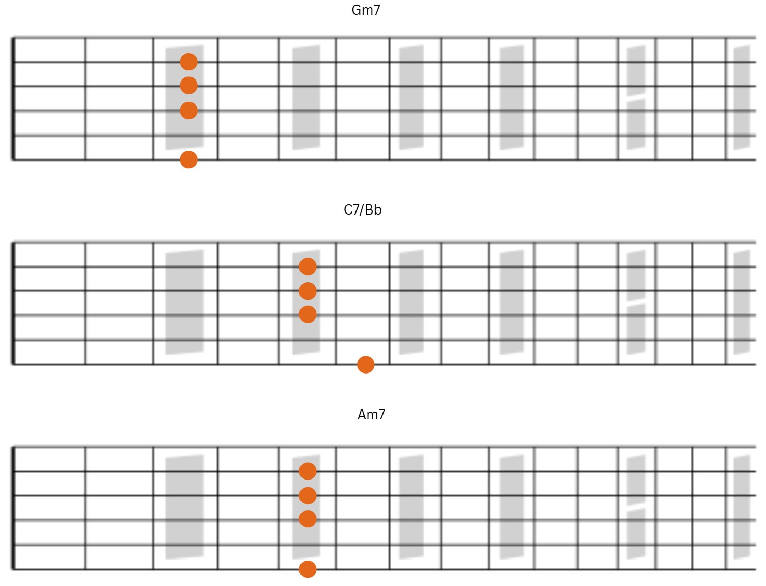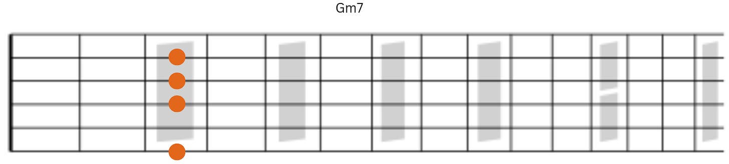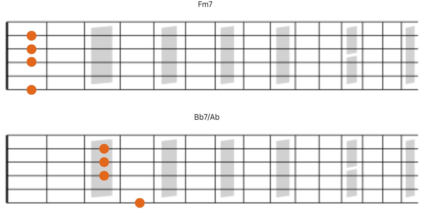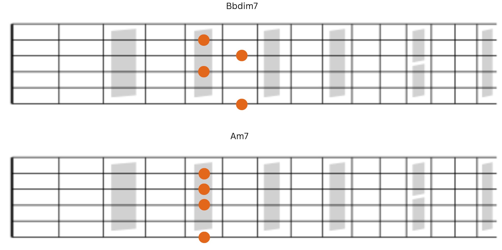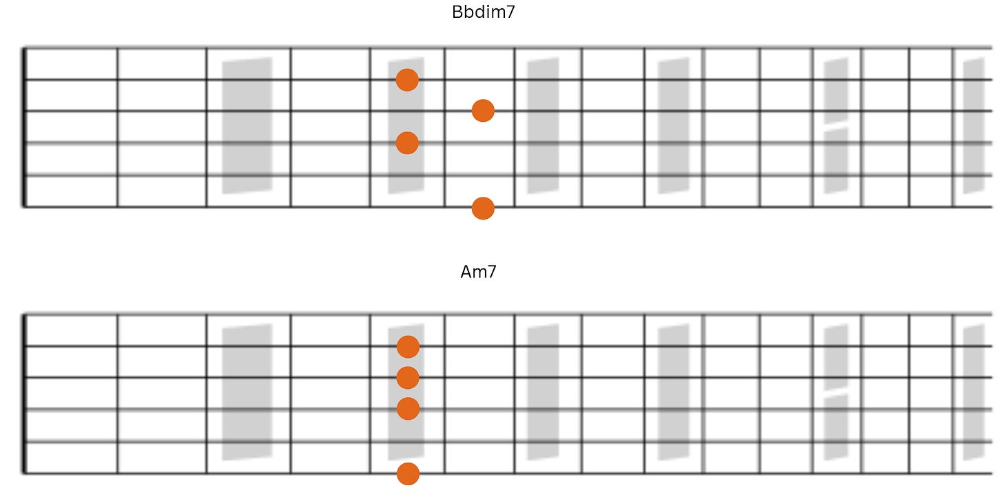 Next we have Bbdim7 followed by Am7. Notice that notes on strings 2 and 4 remain the same and notes on strings 6 and 3 fall by a half-step.