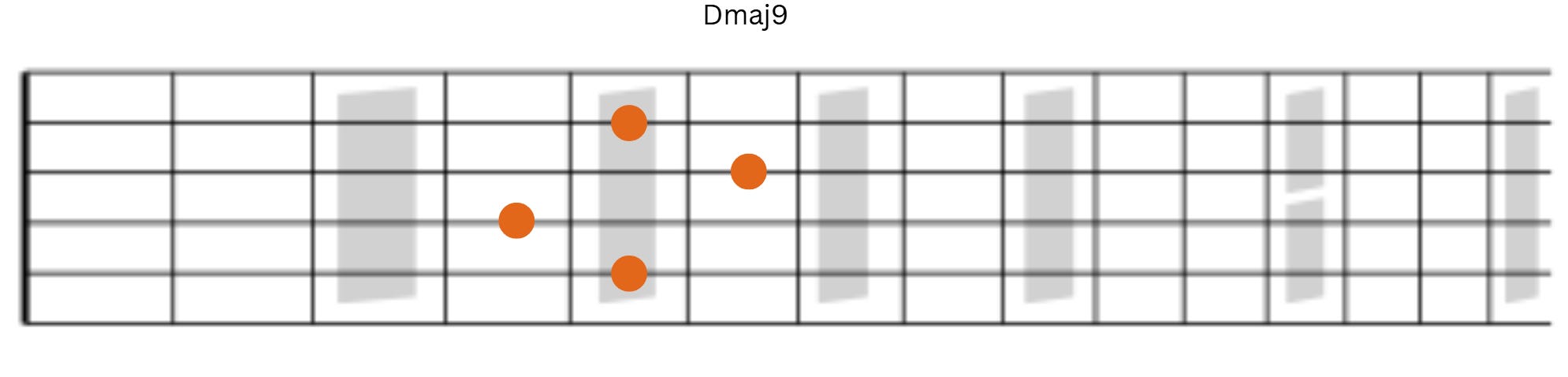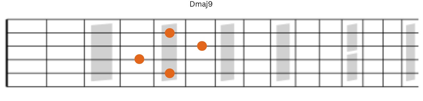 Here we will start with Dmaj9. This allows us to keep the root, third, and seven on strings 6-4-3 while string 2 will have extensions or the fifth of the chord.