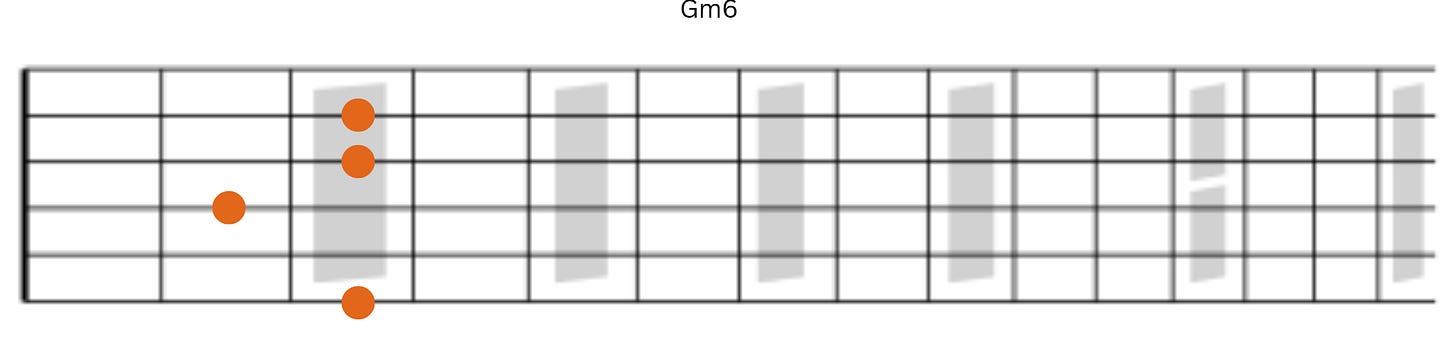 Then we have Gm6. Again observe how some notes remain the same while others fall. Generally, notes will descend.