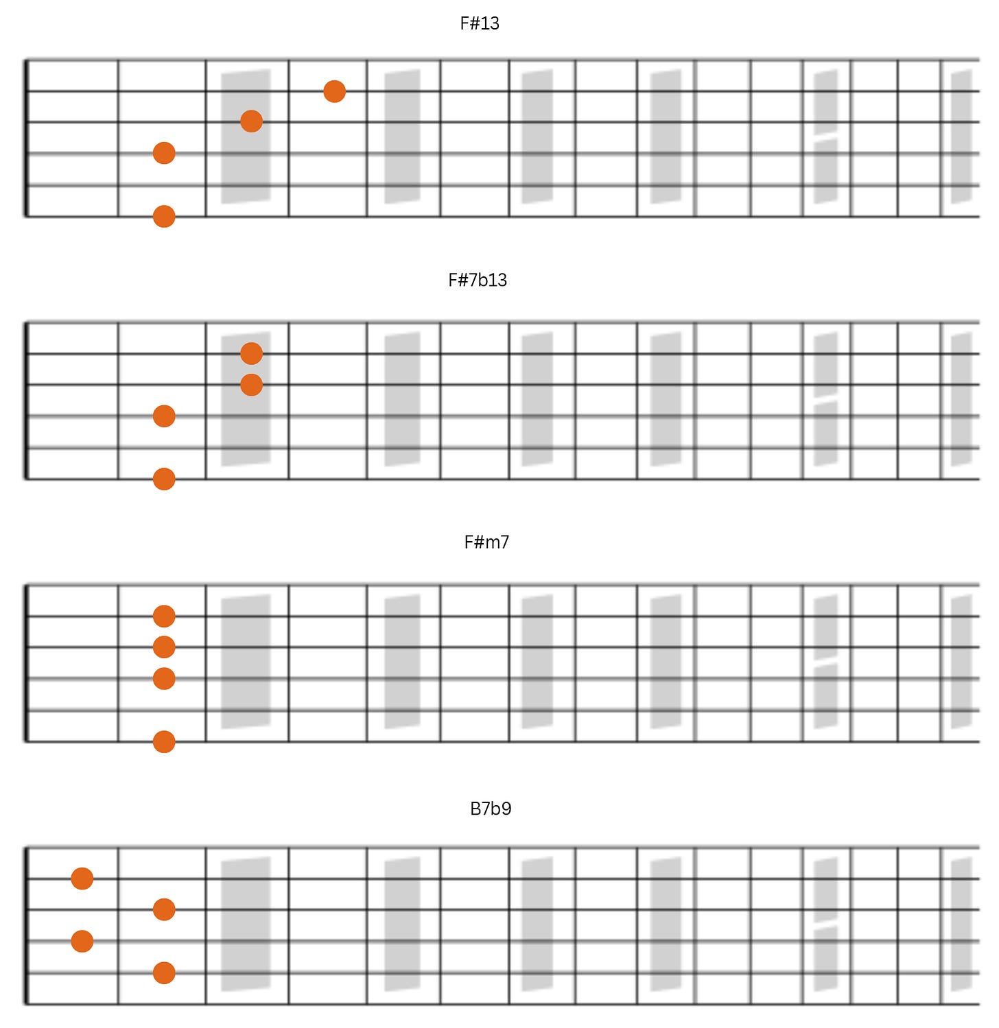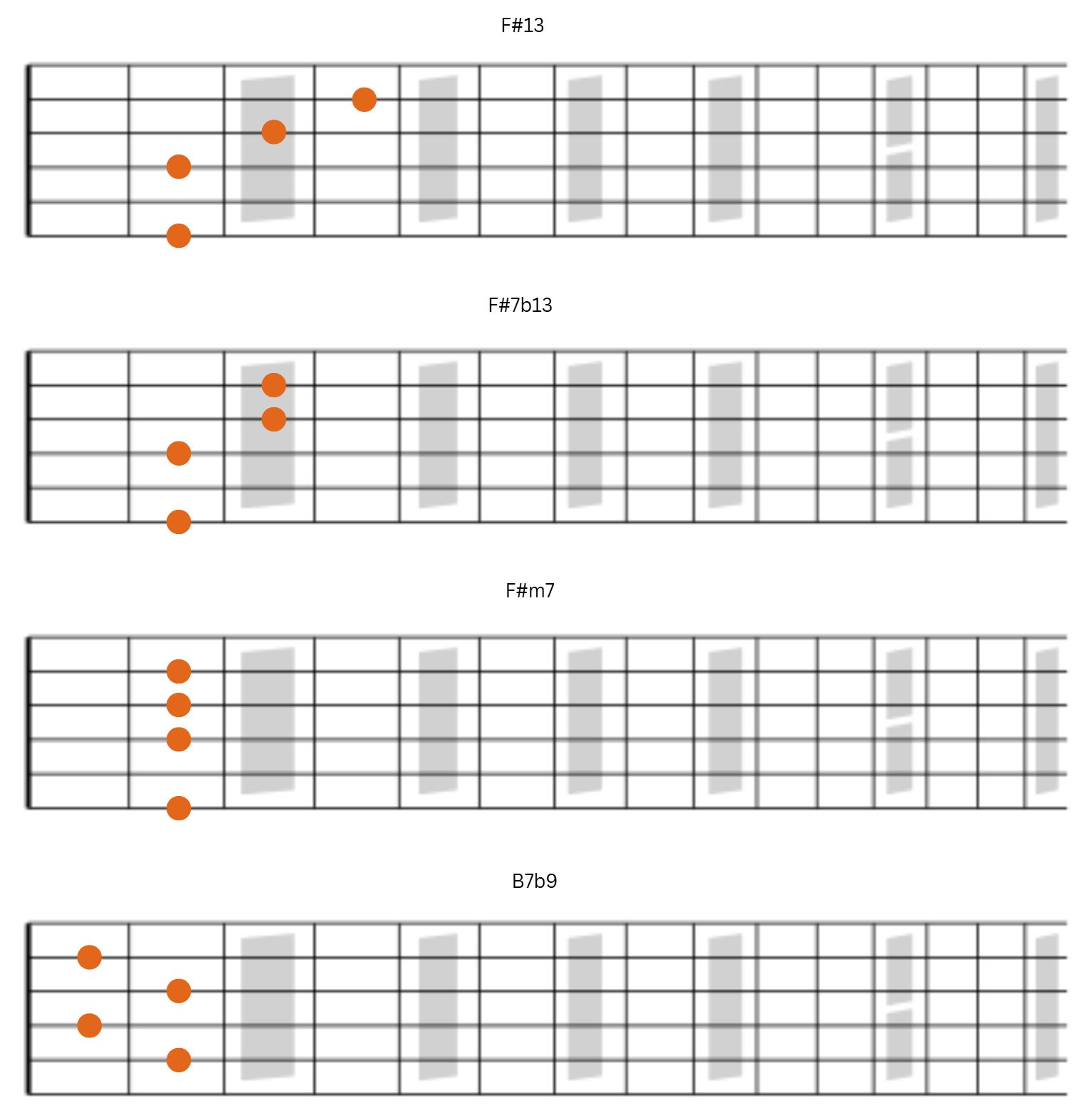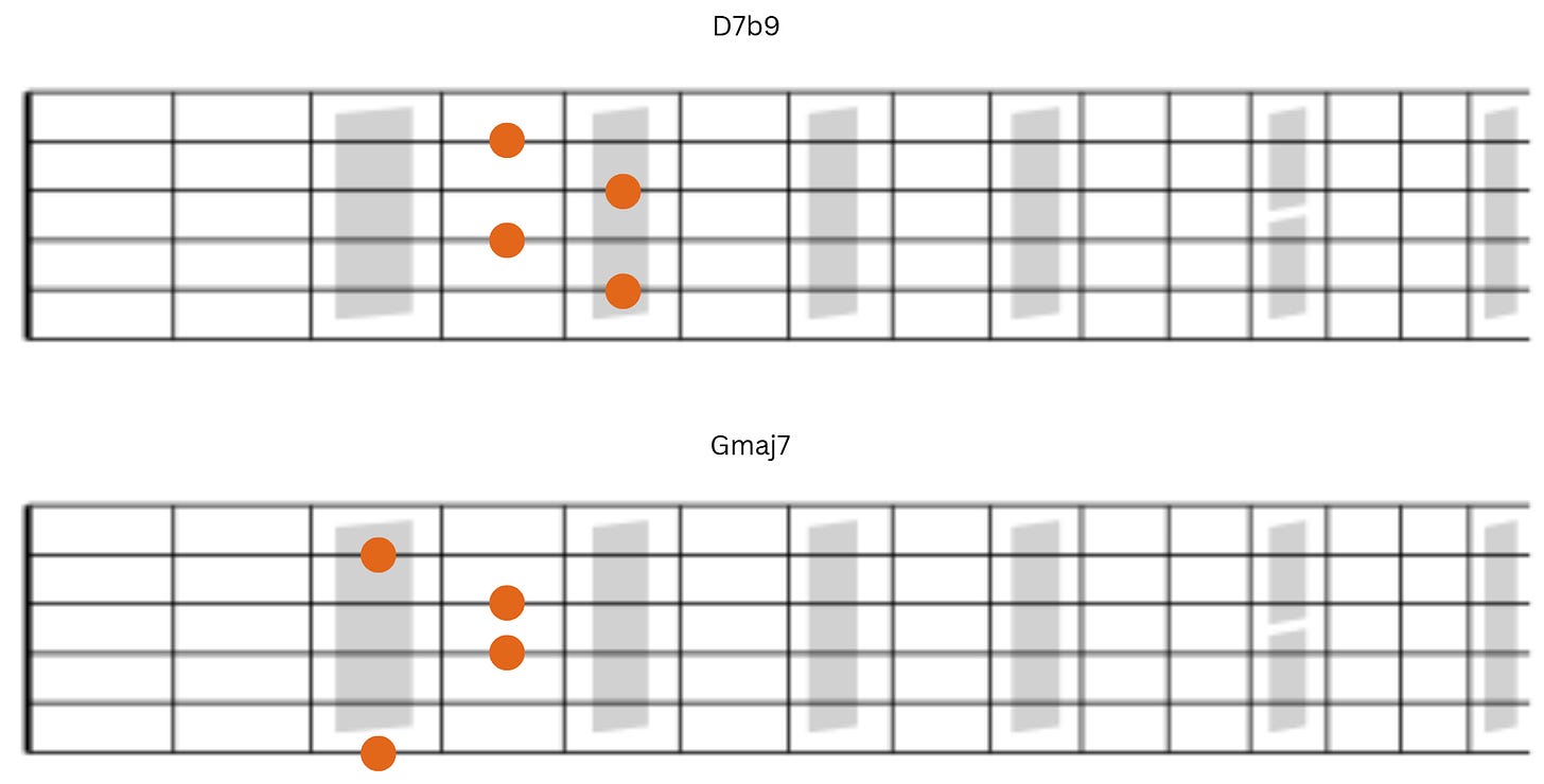 We’ll work with four-note voicings with string combinations of 5-4-3-2 or 6-4-3-2. Essentially, the upper three notes of the chord will remain on strings 4-3-2 while the bass note will land on string 6 or 5.