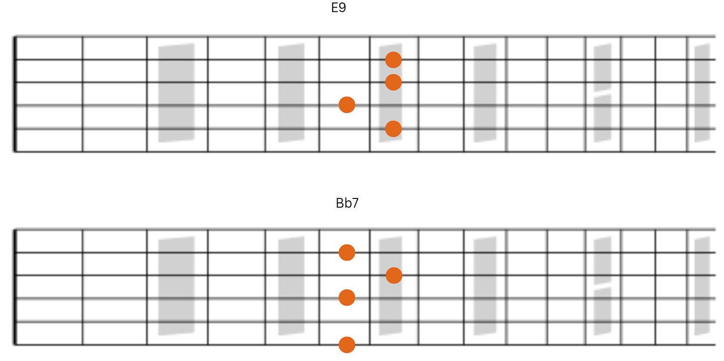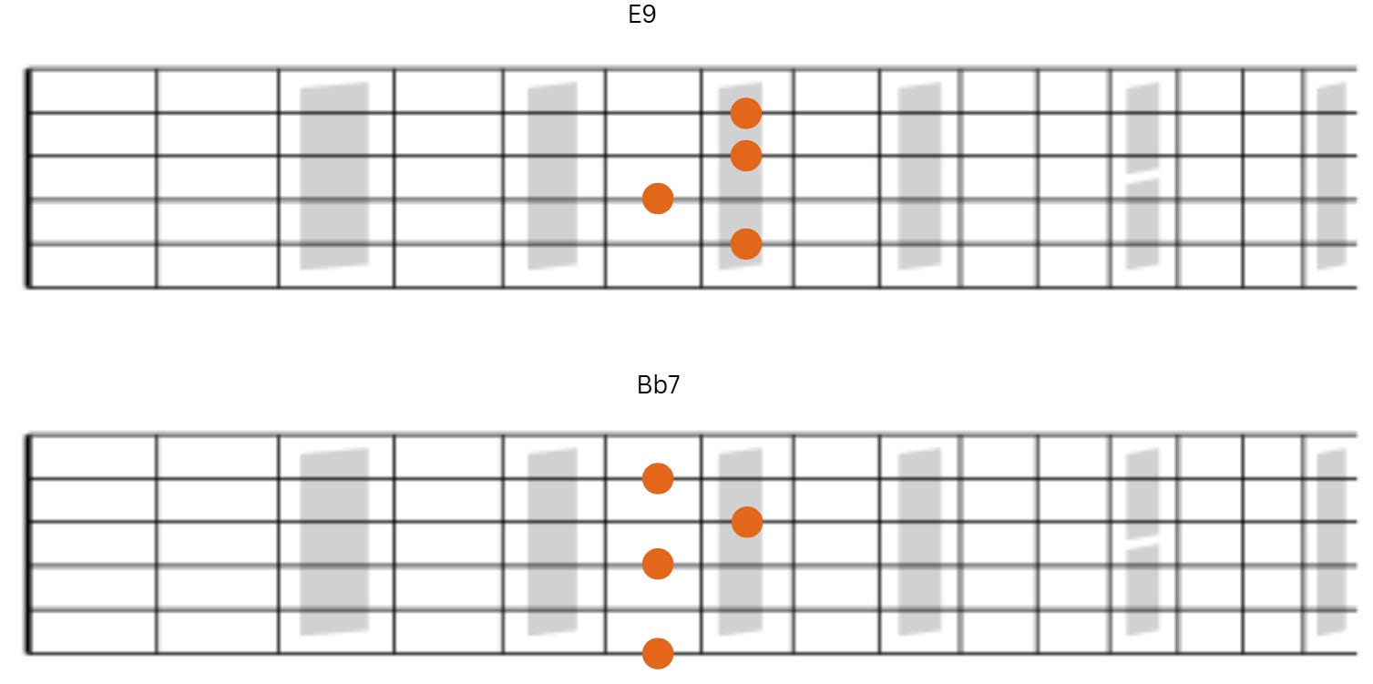 Next we have E9 followed by Bb7. Notice that the notes on strings 3 and 4 remain the same.