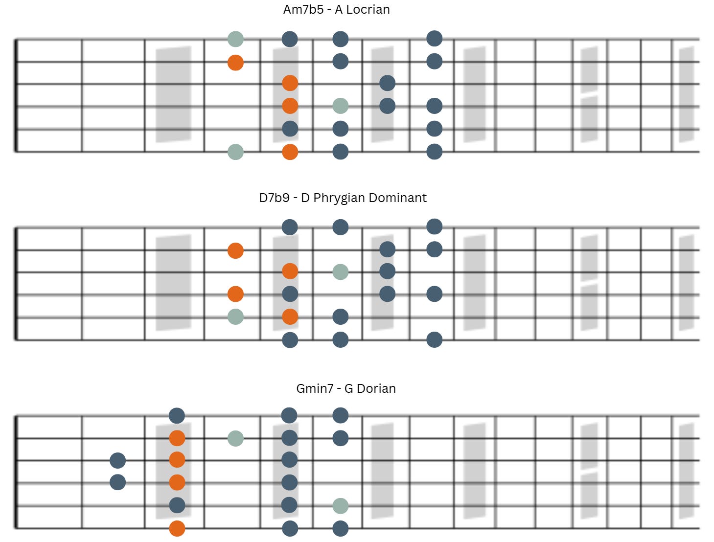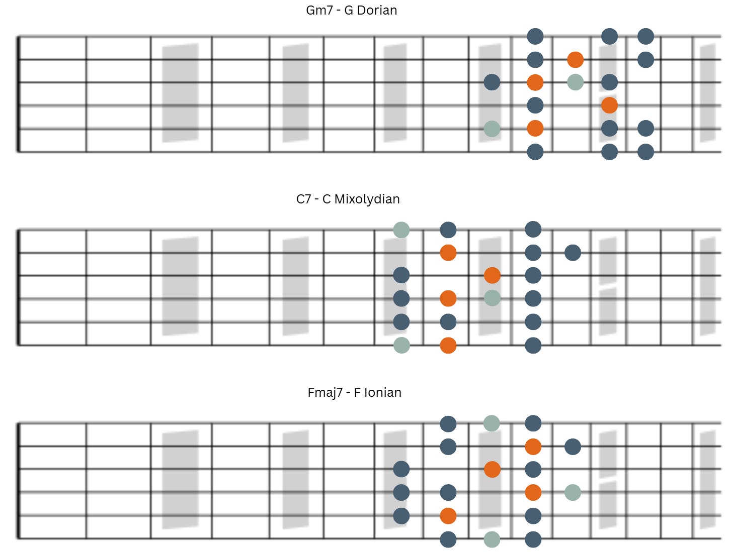 Next we have a ii-V-I progression in the key of F. Notice that the scales are the same for these three chords. The passing tone will change based on the chord and it’s roll.