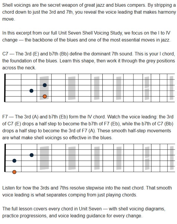 Unit Seven Shell Voicing StudyExcerpt: The I-IV in the BluesJim EllisMar 14, 2026ShareThis Substack is reader-supported. To receive new posts and support my work, consider becoming a free or paid subscriber.Subscribe